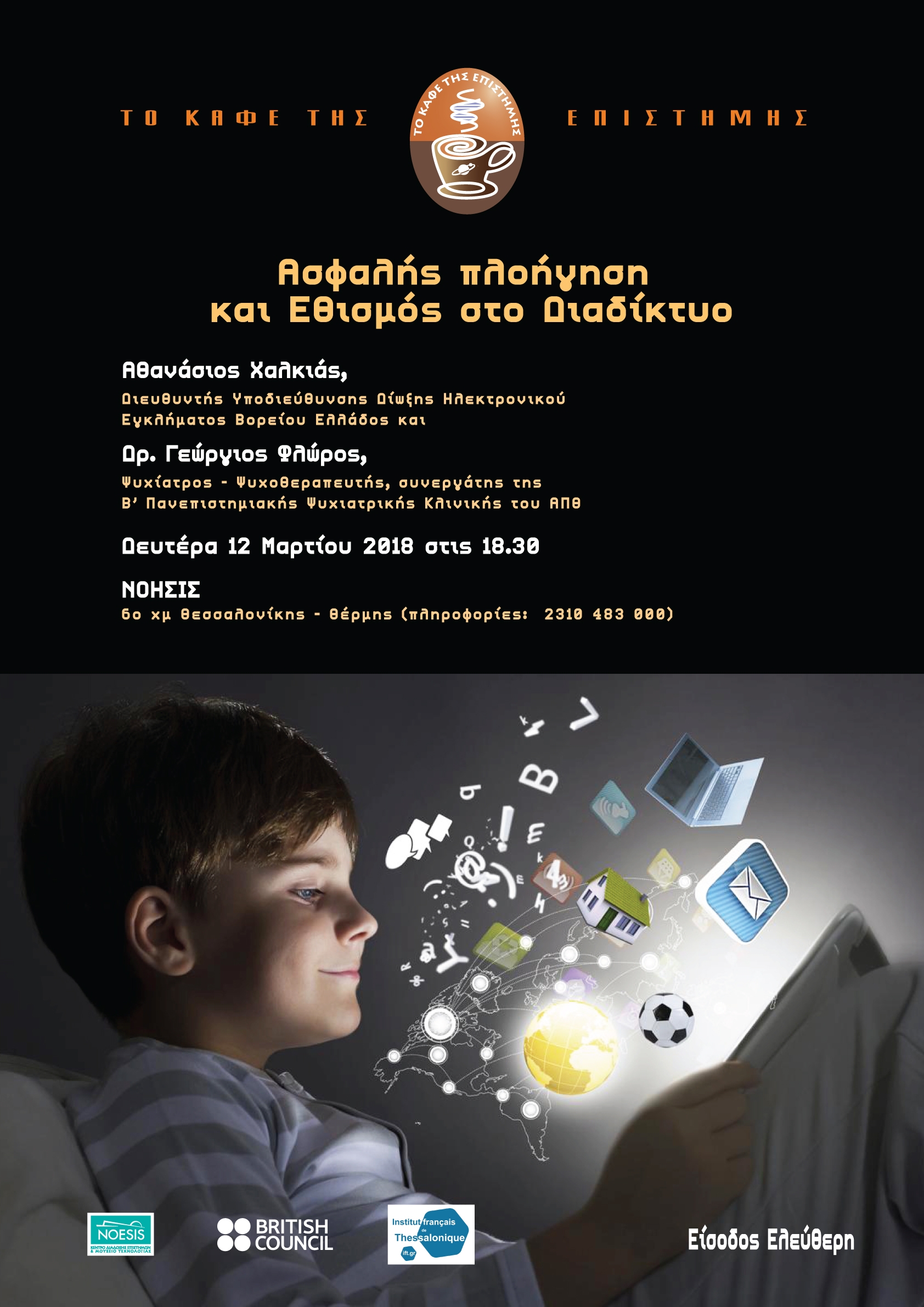 Με τη συνεργασία του Γαλλικού Ινστιτούτου Θεσσαλονίκης, του Βρετανικού Συμβουλίου και του ΝΟΗΣΙΣ συνεχίζεται για δέκατη τρίτη συνεχή χρονιά η πραγματοποίηση των «Καφέ της Επιστήμης», που όπως πάντα, σας προσκαλούν να συζητήσετε με τους ειδικούς επιστημονικά ζητήματα που σας ενδιαφέρουν. Το θέμα του επόμενου Καφέ της Επιστήμης, αφορά στην ασφαλή πλοήγηση και τον εθισμό στο διαδίκτυο.