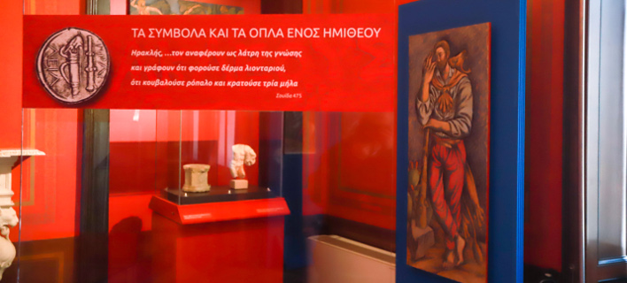 Τα δεκαεννέα σύγχρονα ζωγραφικά έργα του εικαστικού Παύλου Σάμιου, Καθηγητή της Ανώτατης Σχολής Καλών Τεχνών, αντλούν την έμπνευσή τους από τον Ηρακλή και τους Άθλους του και συνομιλούν µε τα αντικείμενα της έκθεσης, τα οποία καλύπτουν ένα ευρύ πολιτειακό, γεωγραφικό και χρονολογικό πλαίσιο -πόλεις-κράτη, έθνη, βασίλεια και αυτοκρατορίες από τη Δυτική Μεσόγειο μέχρι και τα βάθη της Ανατολής και από τους κλασικούς μέχρι και τους νεότερους χρόνους-μέσα από μία λιτή και εμπνευσμένη μουσειογραφική προσέγγιση του Γιάννη Μετζικώφ.