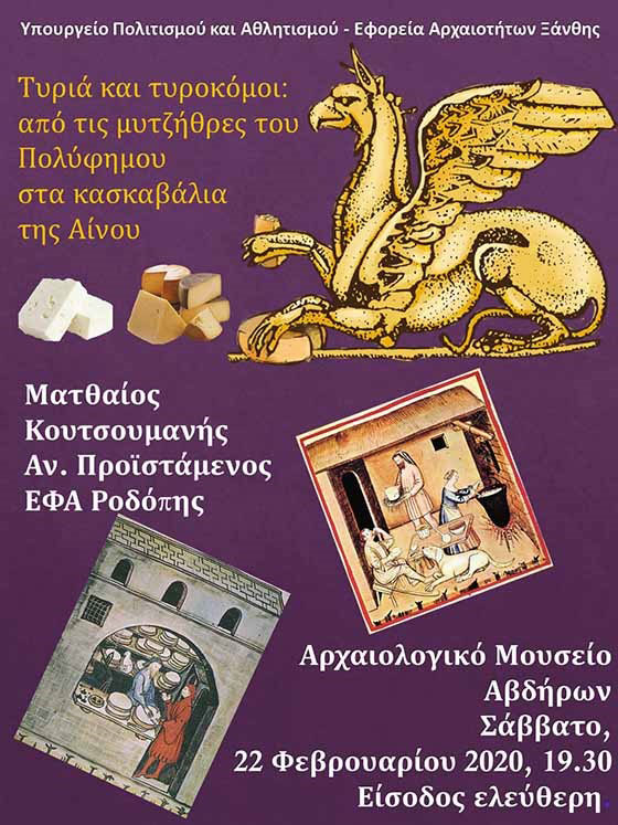 Η γοητευτική ομιλία του αρχαιολόγου κ. Κουτσουμανή πραγματοποιήθηκε το Σάββατο 22 Φεβρουαρίου 2020, στις 7.30 το απόγευμα, στο Αρχαιολογικό Μουσείο Αβδήρων. Ακολούθησε γευσιγνωσία τυριών – προσφορά του Γρύπα των Αβδήρων και τυροκόμων της περιοχής.