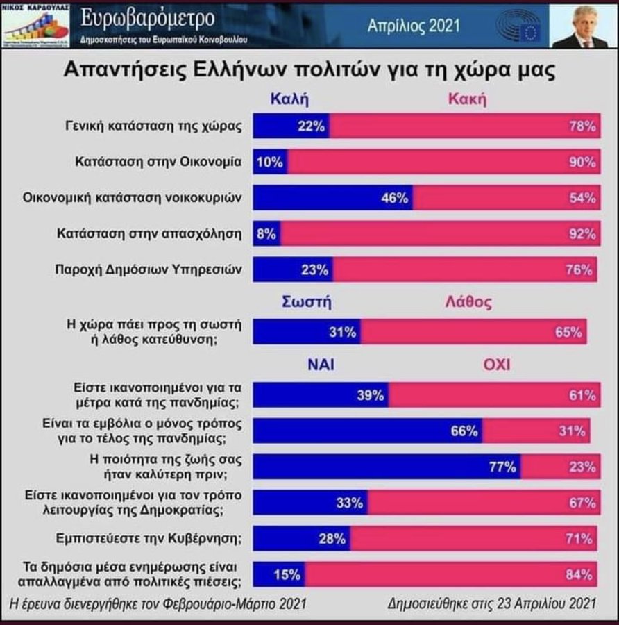 Ο λόγος; Απλούστατος! Επειδή οι Ευρωπαίοι δημοσιεύουν αποτελέσματα ερευνών εντελώς αντίθετα από αυτά τα οποία δείχνουν συνεχώς τα ελληνικά σαΐνια της Alco, GPO, Metron Analysis κλπ , διαμορφώνοντας τη μαγική εικόνα μιας παραδείσιας Ελλάδας , της οποίας οι πολίτες πιστεύουν πως ο τόπος έχει εδώ και δύο χρόνια την καλύτερη κυβέρνηση από την εποχή του Περικλέους και αναπέμπουν ευχές στον Ύψιστο που φρόντισε να εμπιστευθεί σ΄αυτήν τη διαχείριση της κρίσης της Πανδημίας και όχι στον ΣΥΡΙΖΑ-ΠΣ. Πανωλεθρίαμβος με...11.οοο νεκρούς σε οχτώ μήνες!