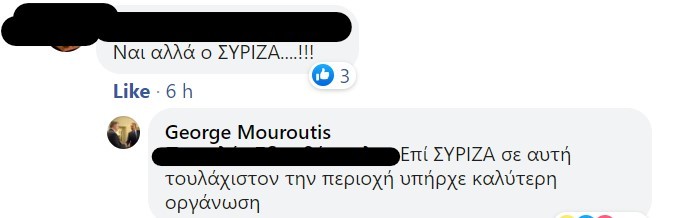 Μάλιστα, όταν κάποιος άλλος χρήστης αναφέρθηκε στον ΣΥΡΙΖΑ, ο Γ. Μουρούτης απάντησε δηκτικά: «Επί ΣΥΡΙΖΑ σε αυτή τουλάχιστον την περιοχή υπήρχε καλύτερη οργάνωση».